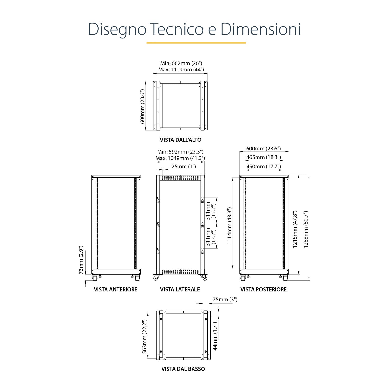 Il rack server 25U si distingue per il suo design open frame che offre un accesso senza pari alle tue apparecchiature. Con una profondità regolabile da 56,0 a 101,7 cm, questo rack si adatta perfettamente a diverse configurazioni, garantendo la massima flessibilità per il tuo ambiente IT.