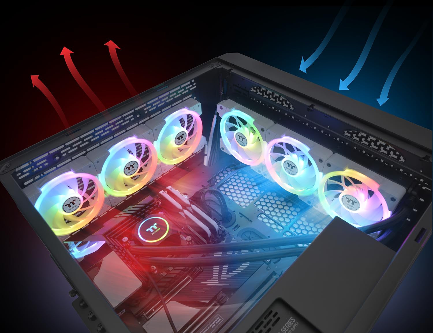 La Thermaltake SWAFAN EX14 non è solo bella da vedere, ma anche potente nelle prestazioni. Il suo design aerodinamico assicura un flusso d'aria ottimale, mantenendo i componenti del tuo PC freschi anche durante le sessioni di gioco più intense o le attività che richiedono elevate prestazioni.