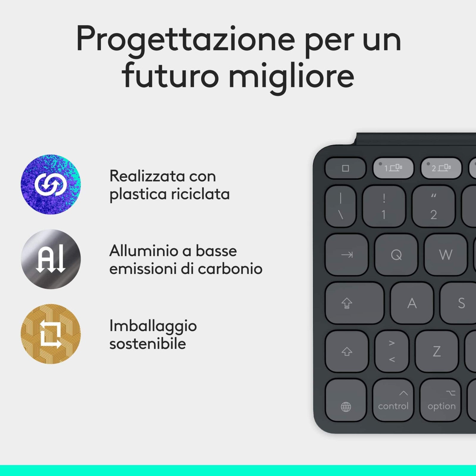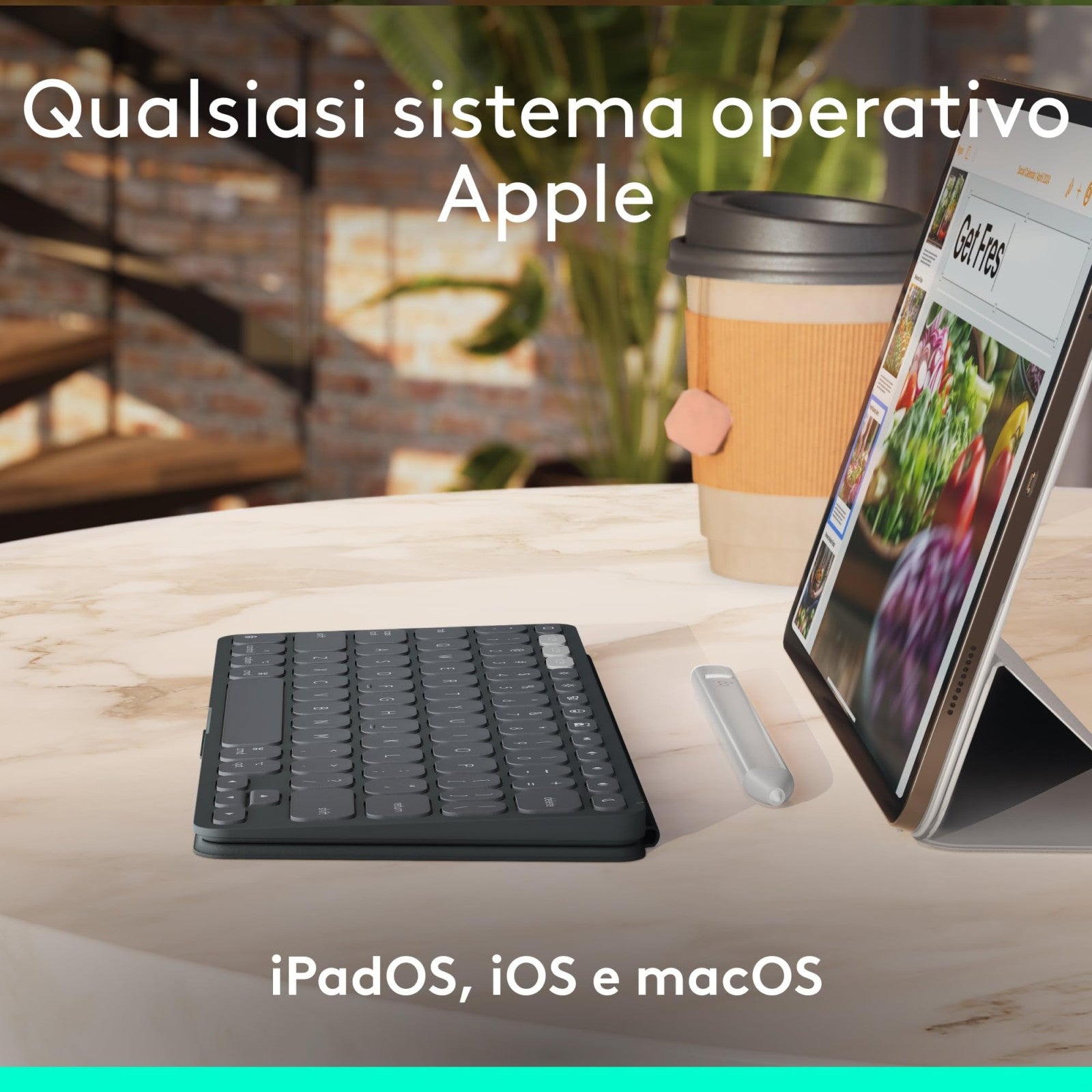 Il colore Graphite conferisce un aspetto professionale e elegante, adatto a ogni ambiente di lavoro. La tastiera wireless portatile si connette facilmente fino a tre dispositivi, permettendo di passare senza problemi tra iPad, iPhone e MacBook con la semplice pressione di un tasto.