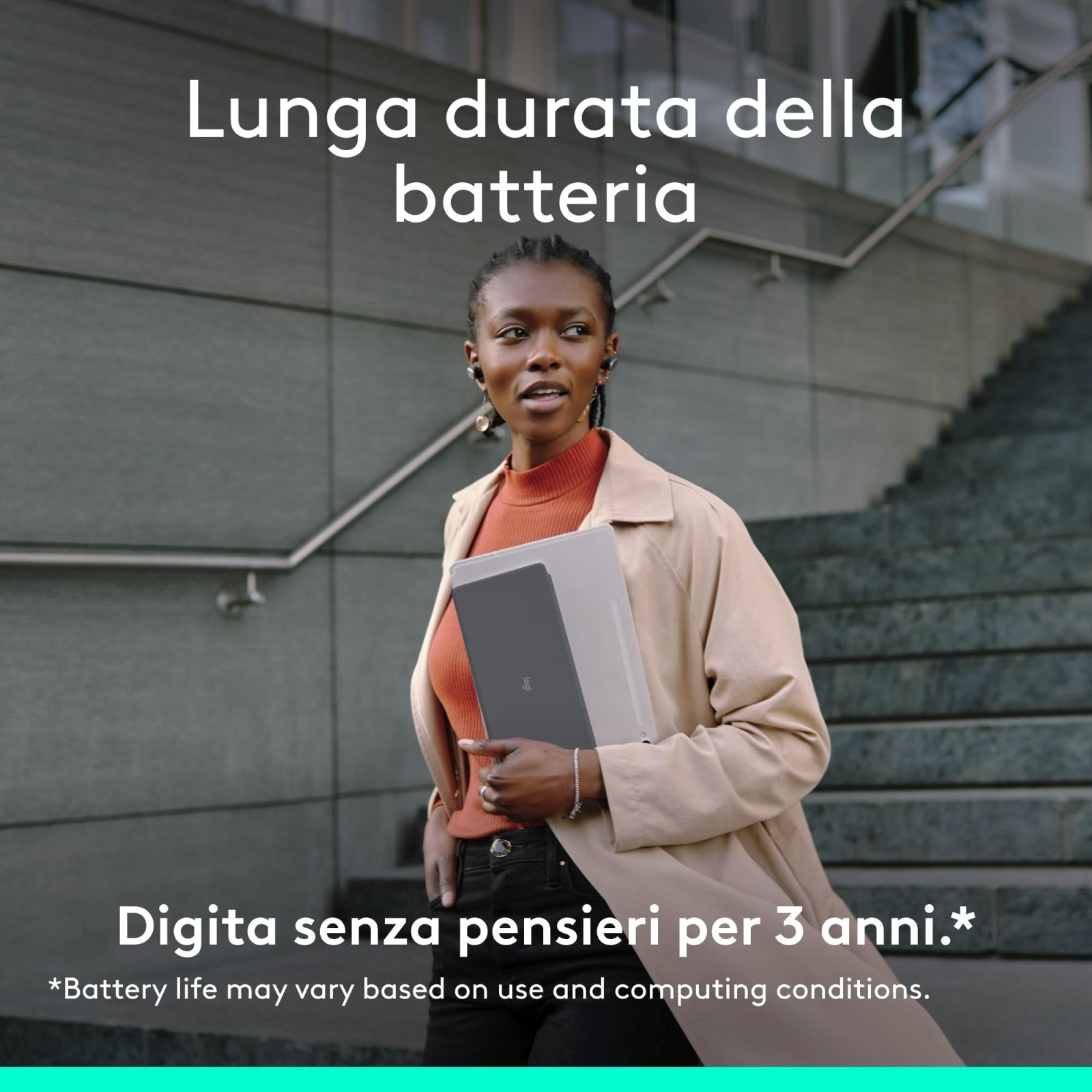 La Keys-To-Go 2 è dotata di batterie a bottone preinstallate che durano fino a 3 anni, eliminando la necessità di ricariche frequenti. Inoltre, il software Logi Options+ (disponibile per Windows e macOS) offre funzionalità aggiuntive come le Smart Actions per ottimizzare il flusso di lavoro.