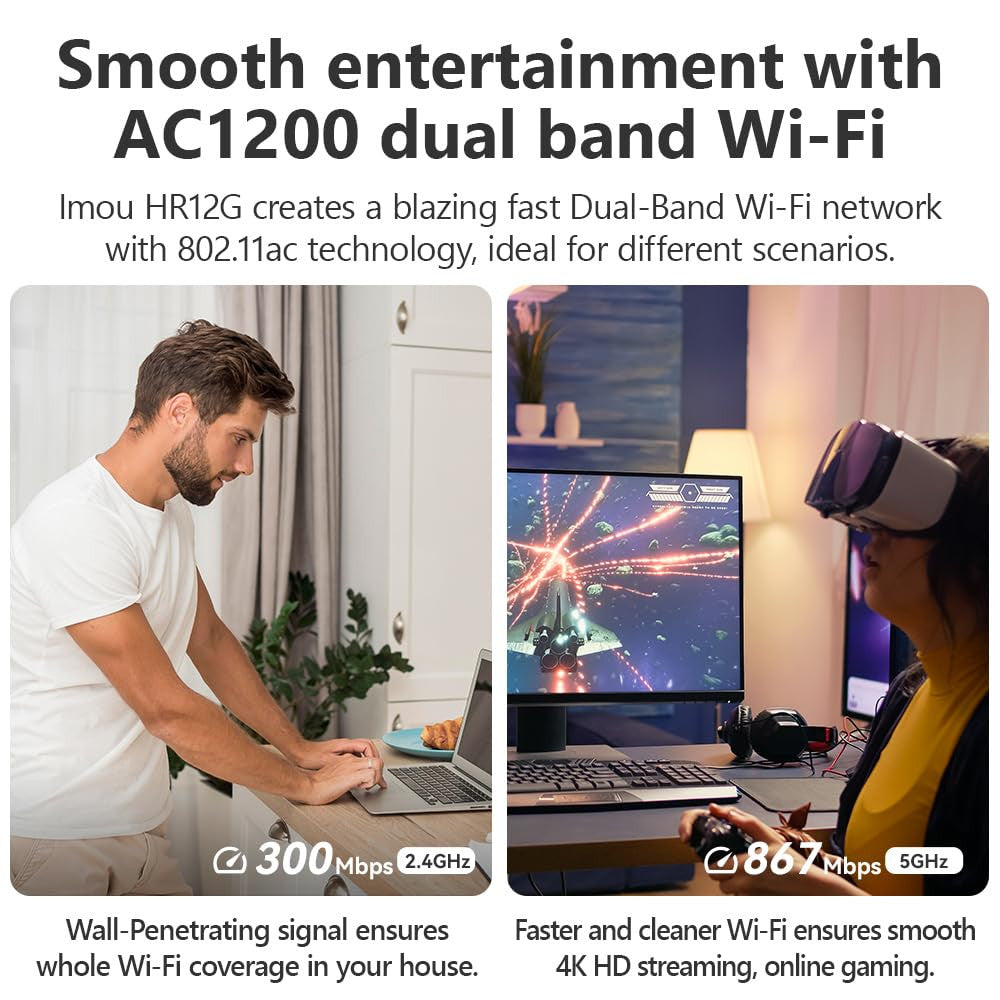 Il Router HR12G di Imou sfrutta la tecnologia Dual Band AC1200 per ottimizzare le prestazioni di rete. Con frequenze di 2,4 GHz e 5 GHz, assicura una copertura estesa e una connessione affidabile in ogni angolo della tua casa.