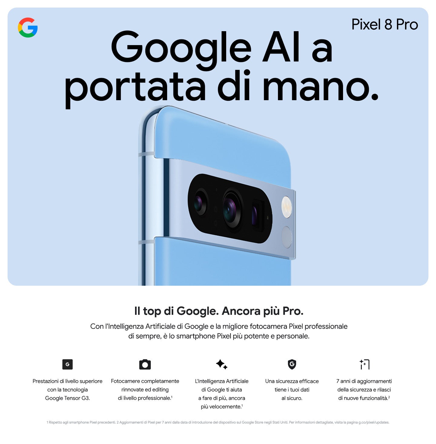 Il Google Pixel 8 Pro non è solo potenza e prestazioni, ma anche sicurezza. Il chip di sicurezza Titan M2 protegge i tuoi dati sensibili, mentre il lettore di impronte digitali e il riconoscimento facciale offrono un accesso rapido e sicuro al tuo dispositivo.
