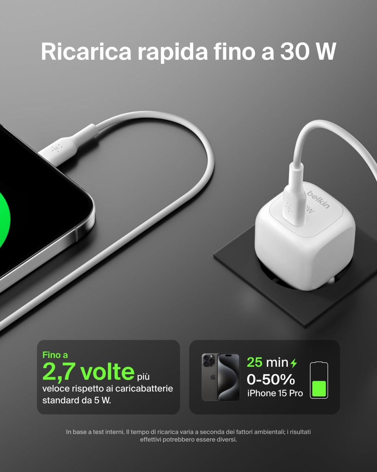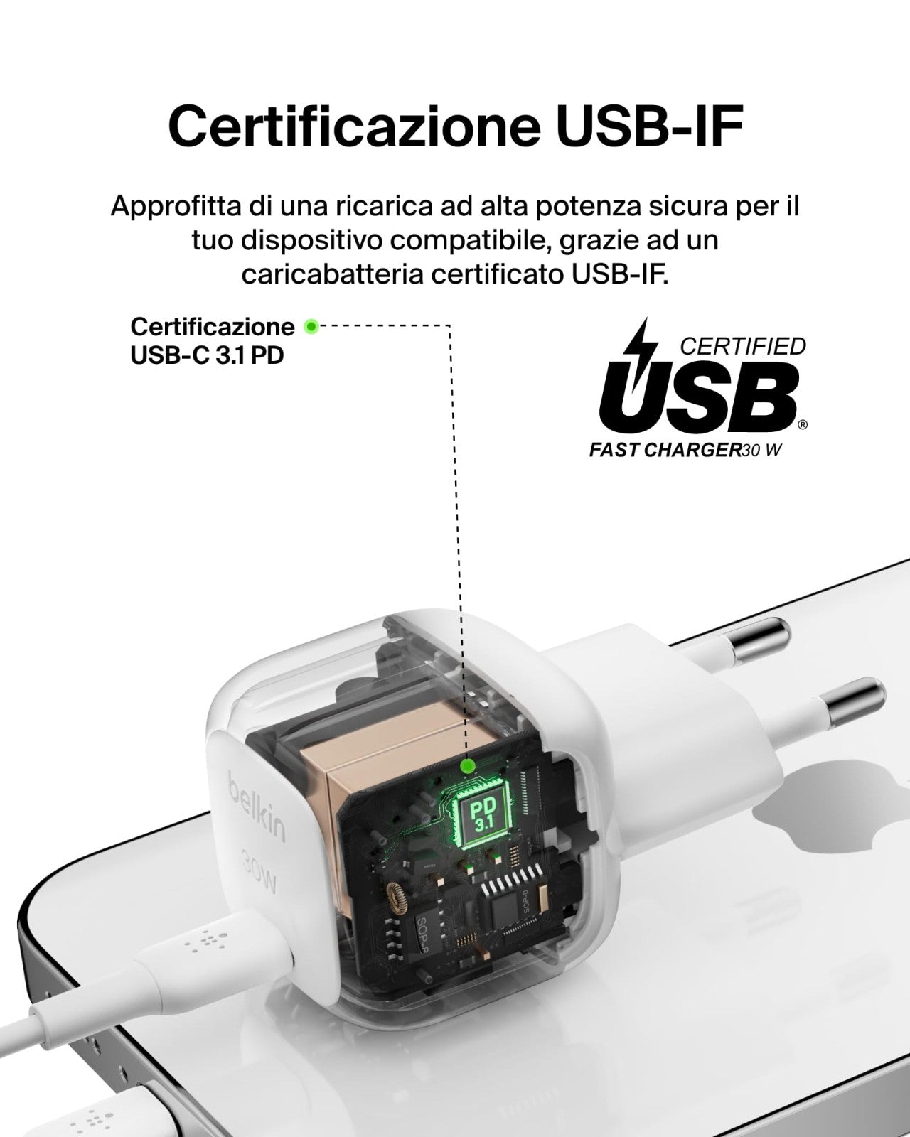 Belkin Caricabatterie USB-C 30W Rapido da Muro per iPhone iPad Samsung Galaxy Bianco