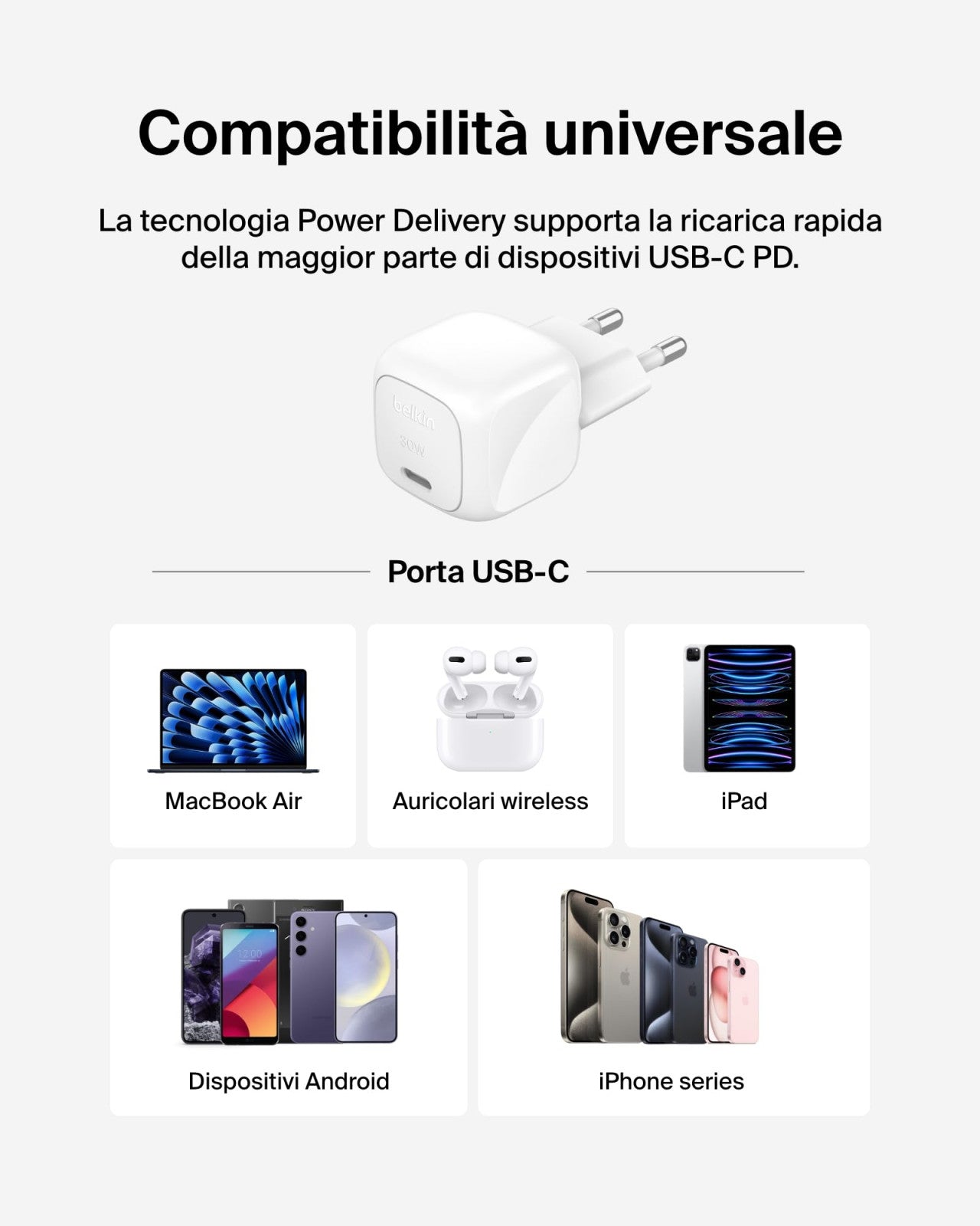 La compatibilità universale è uno dei punti di forza di questo caricabatterie Belkin. È perfetto per i più recenti modelli di iPhone, dalla serie 12 alla 16, così come per i Samsung Galaxy dalla serie S21 alla S24. Inoltre, supporta una vasta gamma di iPad e altri tablet, garantendo versatilità d'uso.