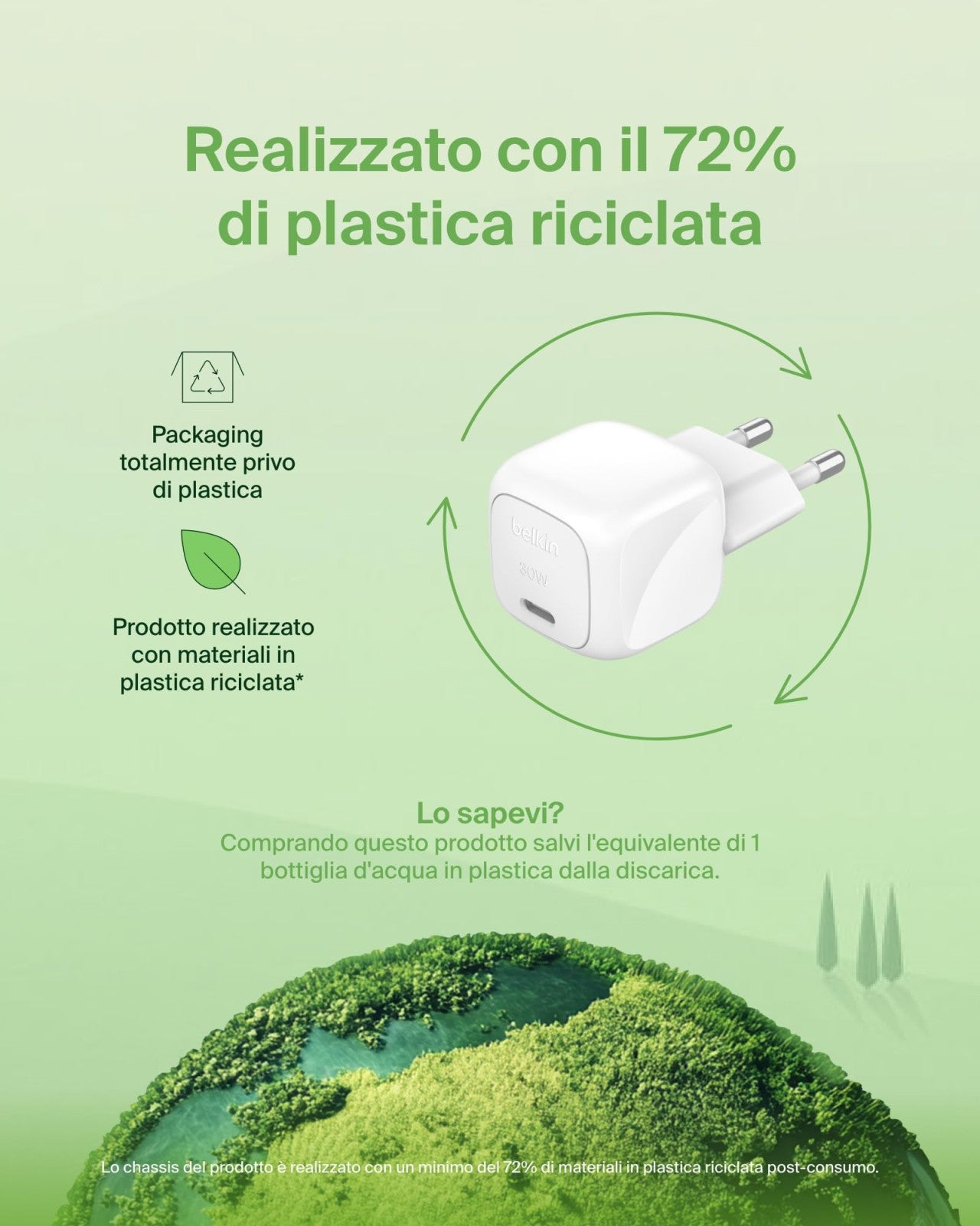 L'impegno di Belkin per la sostenibilità si riflette in questo prodotto. Il caricabatterie è realizzato con materiali riciclati post-consumo e viene fornito in una confezione completamente priva di plastica, riducendo l'impatto ambientale.