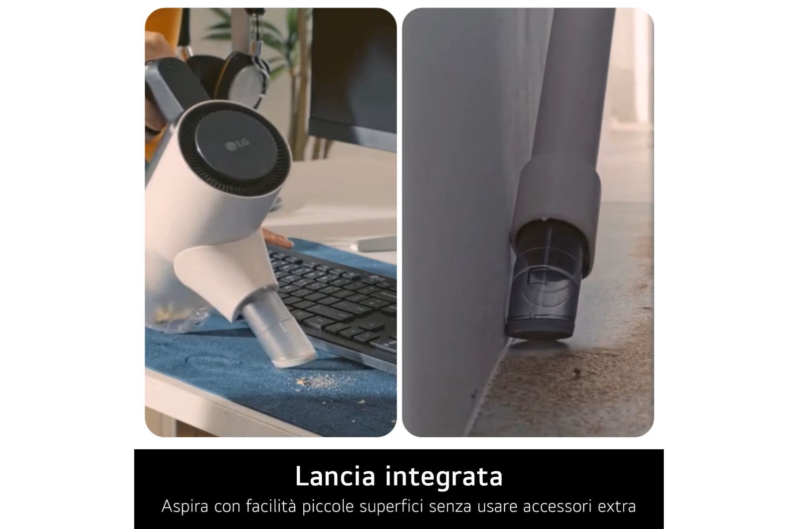 Rumorosità aspirapolvere in modalità Turbo 84dB Compatta - Livelli di aspirazione 3 (normale, power, turbo) STAZIONE ALL-IN-ONE TOWER ALIMENTAZIONE E AUTONOMIA Funzione di svuotamento automatico - Tipologia di batteria Li-ion rimovibile Vani accessori - Batterie in dotazione 1 Sacchetti per la polvere - Ricarica simultanea di 2 batterie - Volume del sacchetto della polvere (L) - Tempo di ricarica (minuti) 240 Sistema di filtraggio - Autonomia - modalità Normale (minuti) 40 Igienizzazione sacchetto con raggi UV - Autonomia - modalità Power (minuti) 20 Indicatore sostituzione sacchetto - Autonomia - modalità Turbo (minuti) 7 DIMENSIONI E PESO Autonomia - Normale con spazzola motorizzata (min.) 30 Peso aspirapolvere / All-in-One Tower (kg) 1,97 / - Autonomia - Power con spazzola motorizzata  (minuti) 15 Peso con imballo (kg) 6.8 Autonomia - Turbo con spazzola motorizzata (minuti) 6 Dimensioni aspirapolvere (L x A x P) (mm) 251 x 1026 x 242 FUZIONI SMART Dimensioni All-in-One Tower (L x A x P) (mm) - Wi-Fi con app LG ThinQ - Dimensioni con imballo (L x A x P) (mm) 740 x 320 x 150 Cronologia delle pulizie - GARANZIA Smart diagnosis - Convenzionale 2 anni Avviso pulizia filtri - Motore Smart Inverter 10 anni I dati presenti in questa scheda sono soggetti a modifiche dovute ad aggiornamenti di prodotto. Vi invitiamo a consultare il sito www.lg.com/it per verificare la congruità degli stessi. La funzione LG ThinQ richiede il download dell'app LG ThinQ (disponibile per dispositivi Android e iOS sui rispettivi app store), la creazione di un account utente ThinQ e la connettività internet. L'autonomia è riferita alla singola batteria e può variare in base a fattori ambientali e all'utilizzo. CODICE PRODOTTO CODICE EAN A9C-AIR1E.BEWQEUR 8806096543528 Aspirapolvere senza filo Potenza 150WA • Solo 1,97kg di peso • Base autoportante • Spazzola per parquet • 2 accessori inclusi (2-in-1 e lancia) • Comandi semplici da usare • Porta accessori integrato nella base • Lancia integrata nei tubi di collegamento • Filtro a 5 strati lavabile