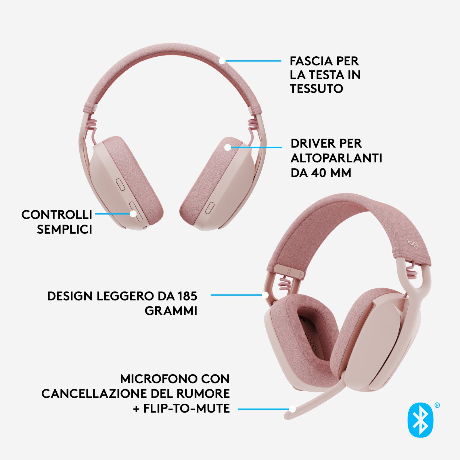 Logitech Zone Vibe 100 Auricolare Wireless Rosa per Musica e Chiamate Bluetooth 5.2