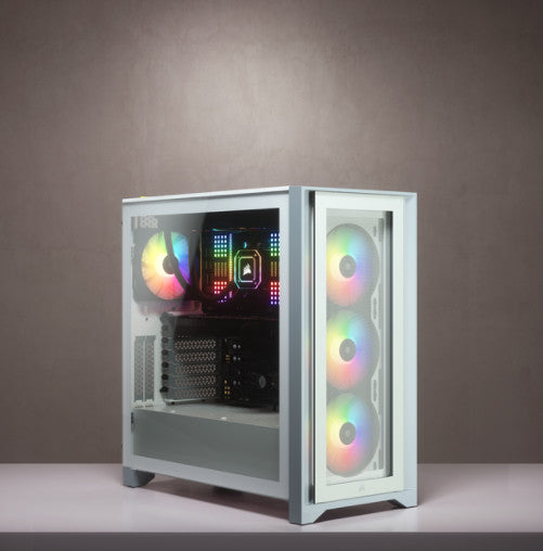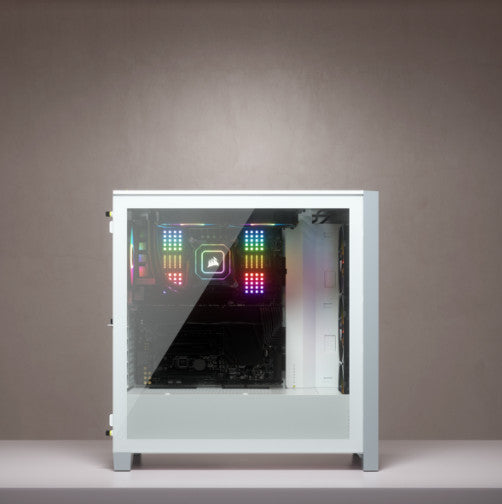 Il Corsair iCUE 4000X RGB si distingue per il suo colore bianco accattivante e il pannello laterale in vetro temperato, che mette in mostra i componenti interni e l'illuminazione RGB personalizzabile. La compatibilità con schede madri ATX, EATX, micro ATX e Mini-ITX offre flessibilità per ogni configurazione.