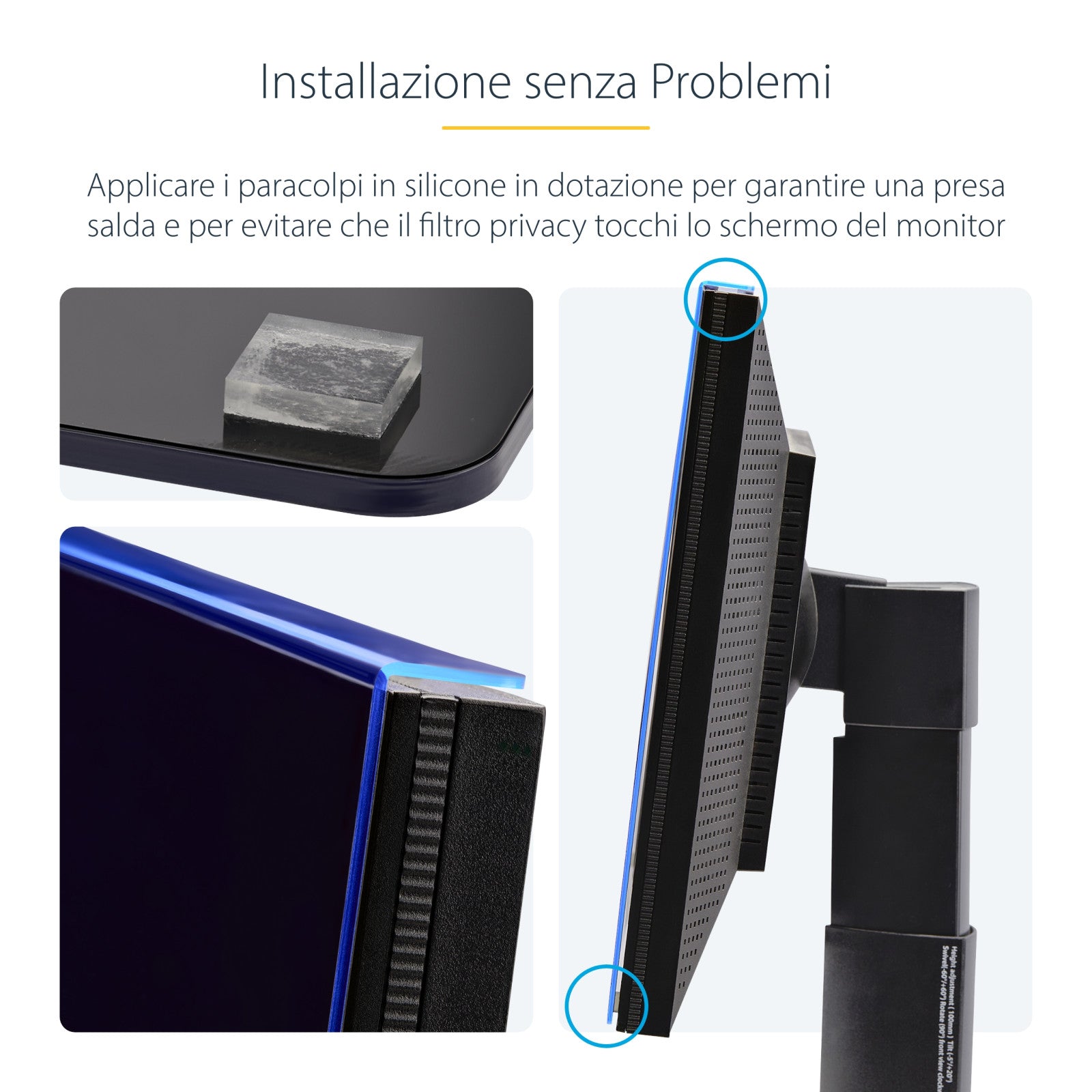 La costruzione in acrilico di alta qualità assicura durabilità e prestazioni affidabili nel tempo. Il filtro privacy StarTech.com si distingue per la sua versatilità: può essere facilmente installato o rimosso in pochi secondi, grazie ai cuscinetti in silicone autoadesivi inclusi che proteggono lo schermo e prevengono il contatto diretto tra il filtro e il display.
