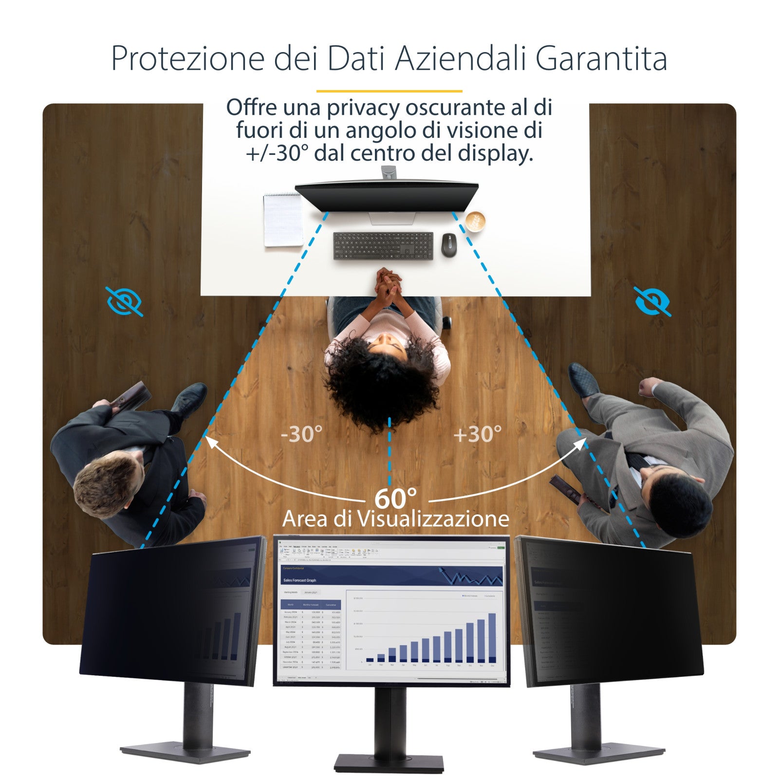 Il filtro privacy monitor StarTech.com offre una soluzione all'avanguardia per la sicurezza visiva, limitando l'angolo di visione a 60 gradi (±30 gradi dal centro). Questa caratteristica impedisce efficacemente le intercettazioni visive, garantendo che le informazioni sensibili rimangano visibili solo all'utente principale.