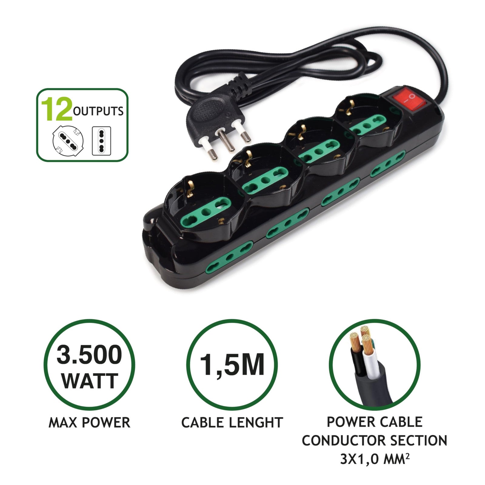 Tecnoware Power Systems Multipresa 12 uscite 4 Schuko nero con interruttore luminoso