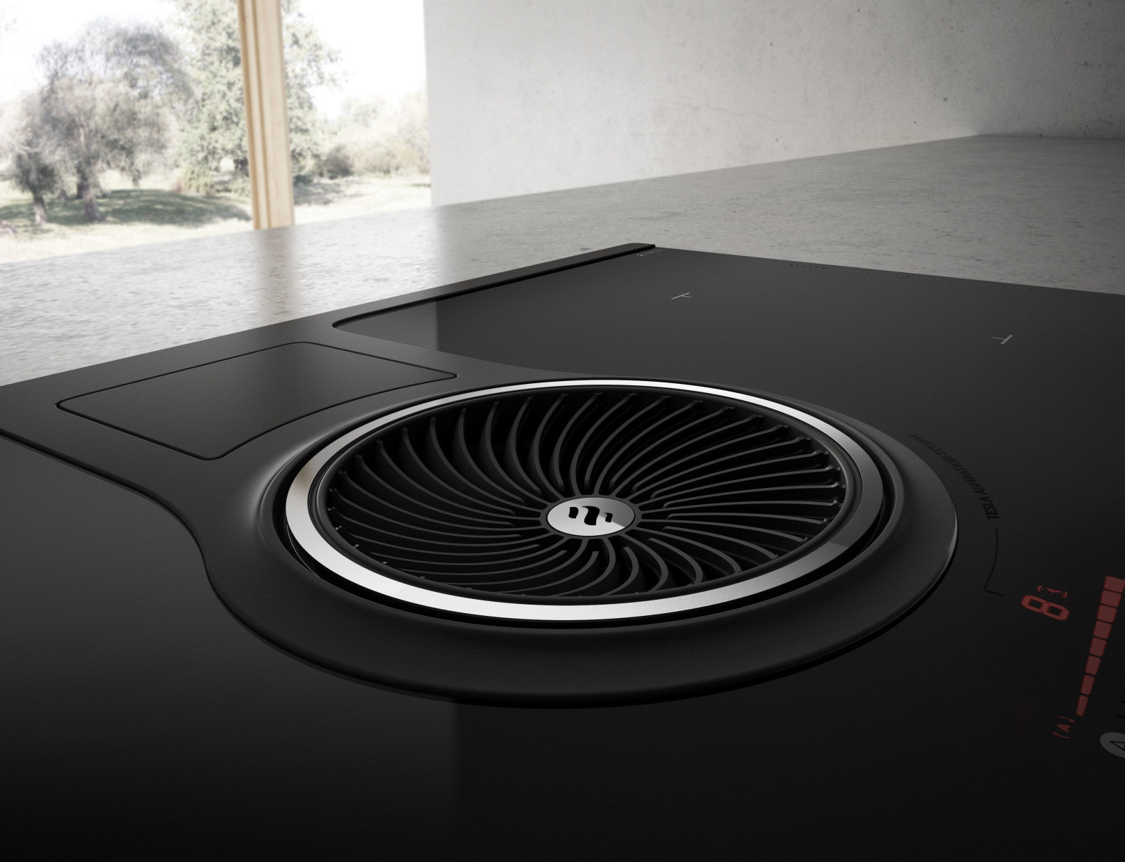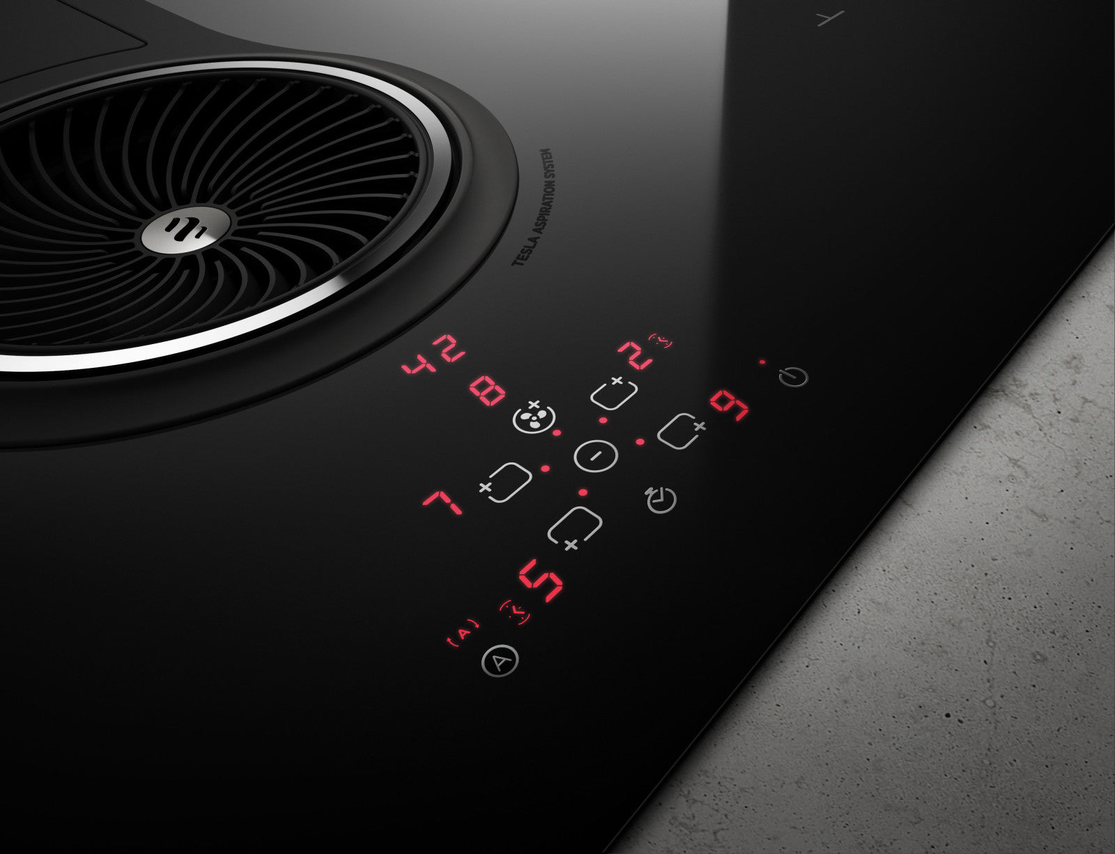 La vera rivoluzione del NIKOLATESLA ONE è la cappa aspirante integrata, posizionata al centro del piano. Questa innovativa soluzione comunica direttamente con le zone di cottura, regolando automaticamente la potenza e la velocità di aspirazione in base alle tue esigenze di cottura.