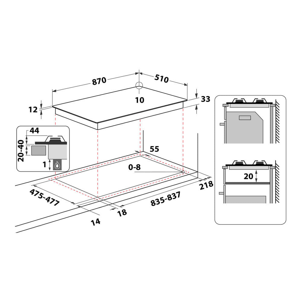 Certificato CE, questo piano cottura a gas è compatibile con il metano, garantendo efficienza energetica e prestazioni ottimali. Le sue dimensioni (870 mm di larghezza, 510 mm di profondità e 33 mm di altezza) lo rendono adatto a diverse configurazioni di cucina.