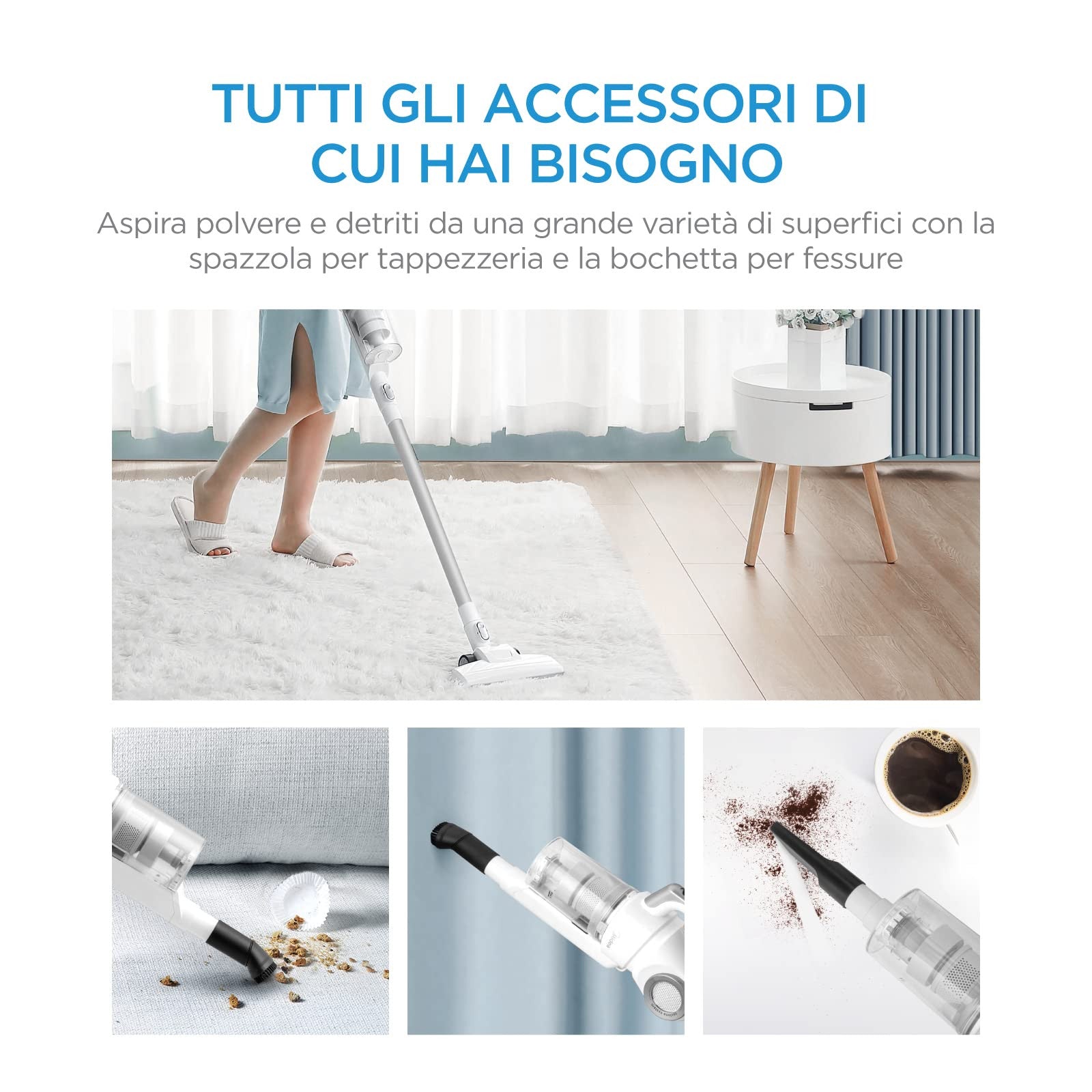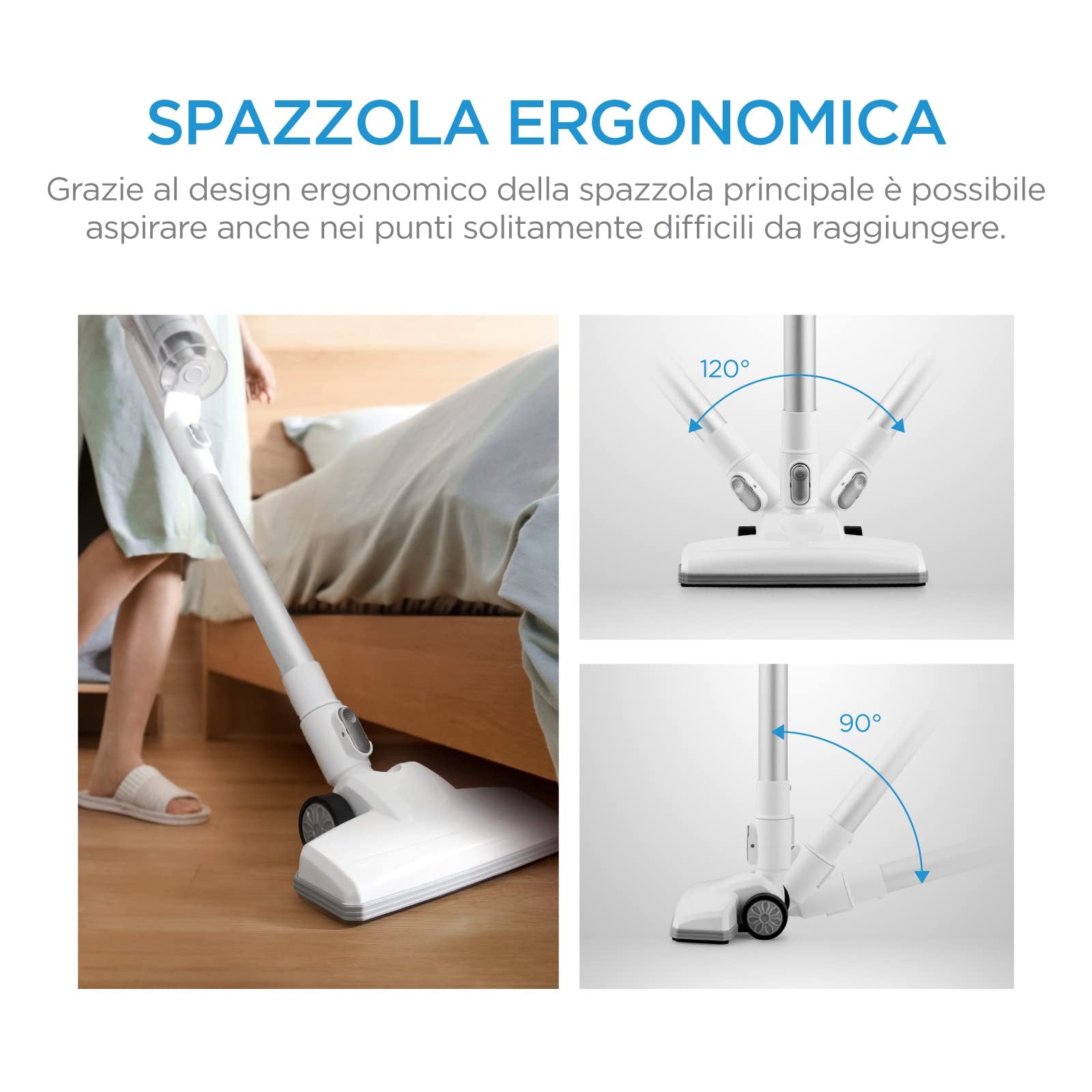 La scopa elettrica Midea si distingue per la sua versatilità, adattandosi perfettamente a diverse superfici come pavimenti duri, tappeti e moquette. Grazie agli accessori inclusi, potrai raggiungere facilmente anche gli angoli più difficili e le superfici elevate, garantendo una pulizia completa in ogni ambiente della casa.