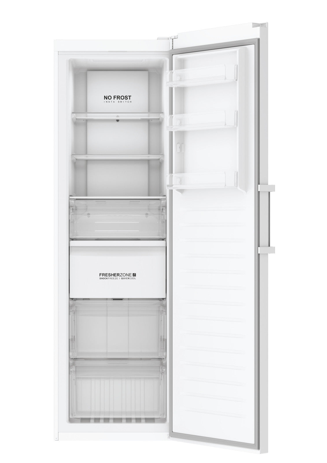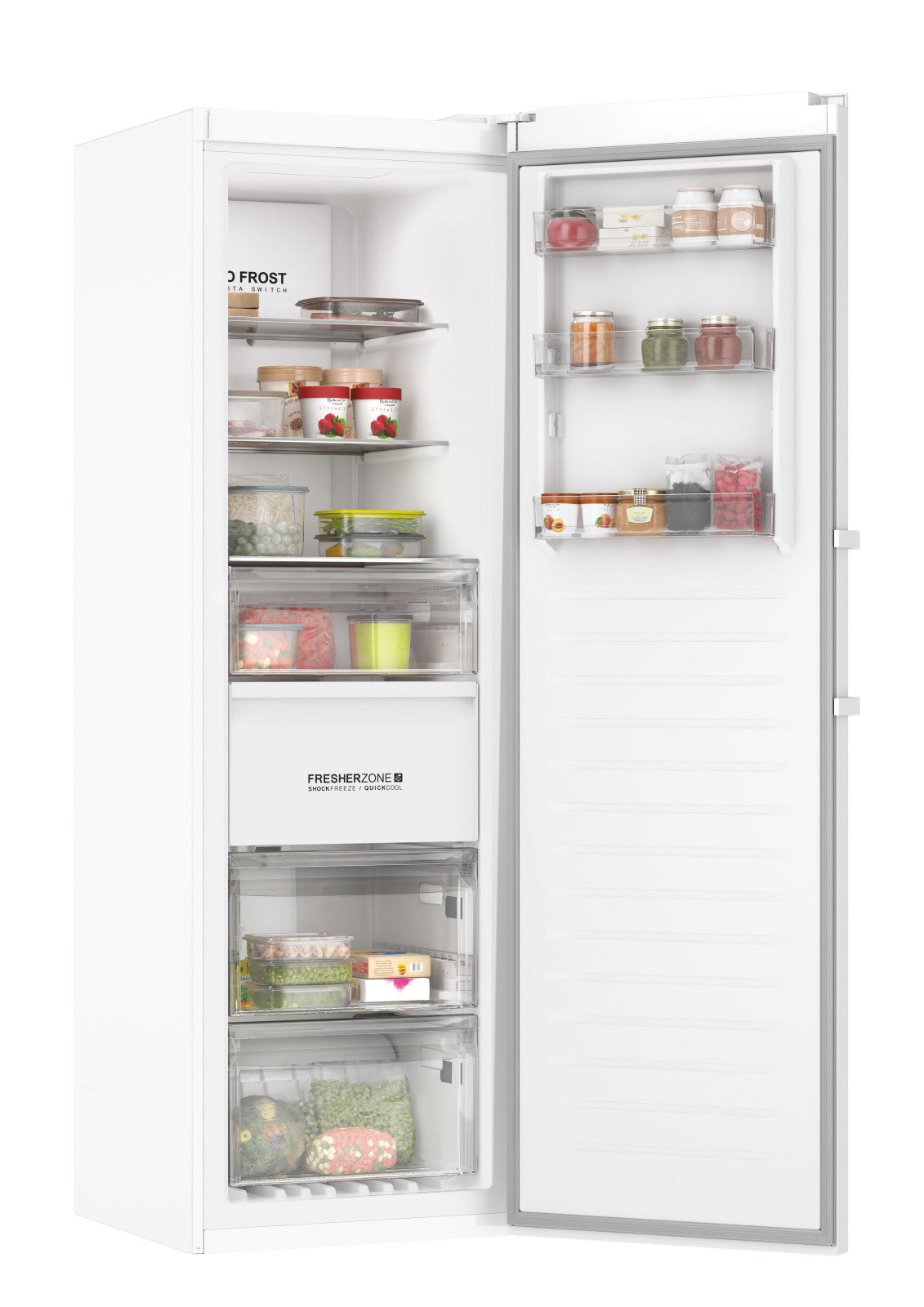 Con il suo design bianco e moderno, il congelatore verticale Haier si integra perfettamente in ogni ambiente. La porta reversibile e l'allarme porta aperta aggiungono ulteriore praticità al tuo quotidiano.