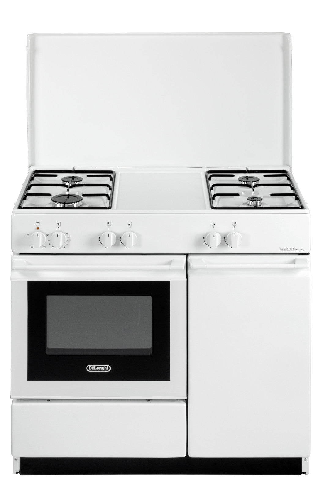 De longhi sew8540nedm: cucina a gas con 4 fuochi, forno elettrico 42L, grill, e valvola di sicurezza. Design bianco, ideale per ogni cucina.