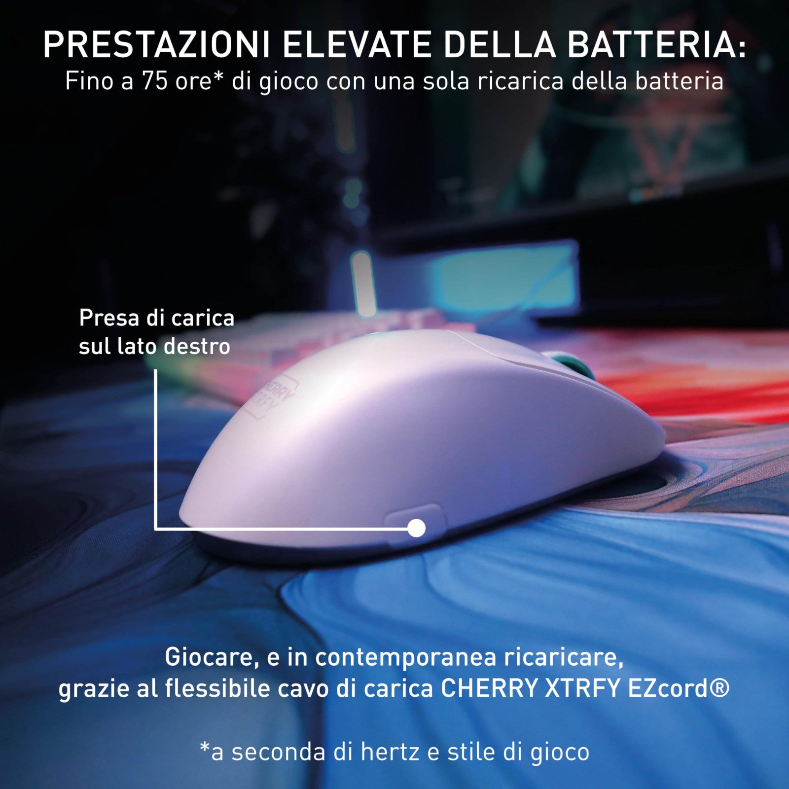 La batteria ad alta capacità offre fino a 75 ore di autonomia, garantendo prestazioni costanti durante le maratone di gioco più intense. In caso di necessità, è possibile ricaricare rapidamente il mouse in soli 2 ore, continuando a giocare senza interruzioni grazie al cavo flessibile CHERRY XTRFY EZcord®.