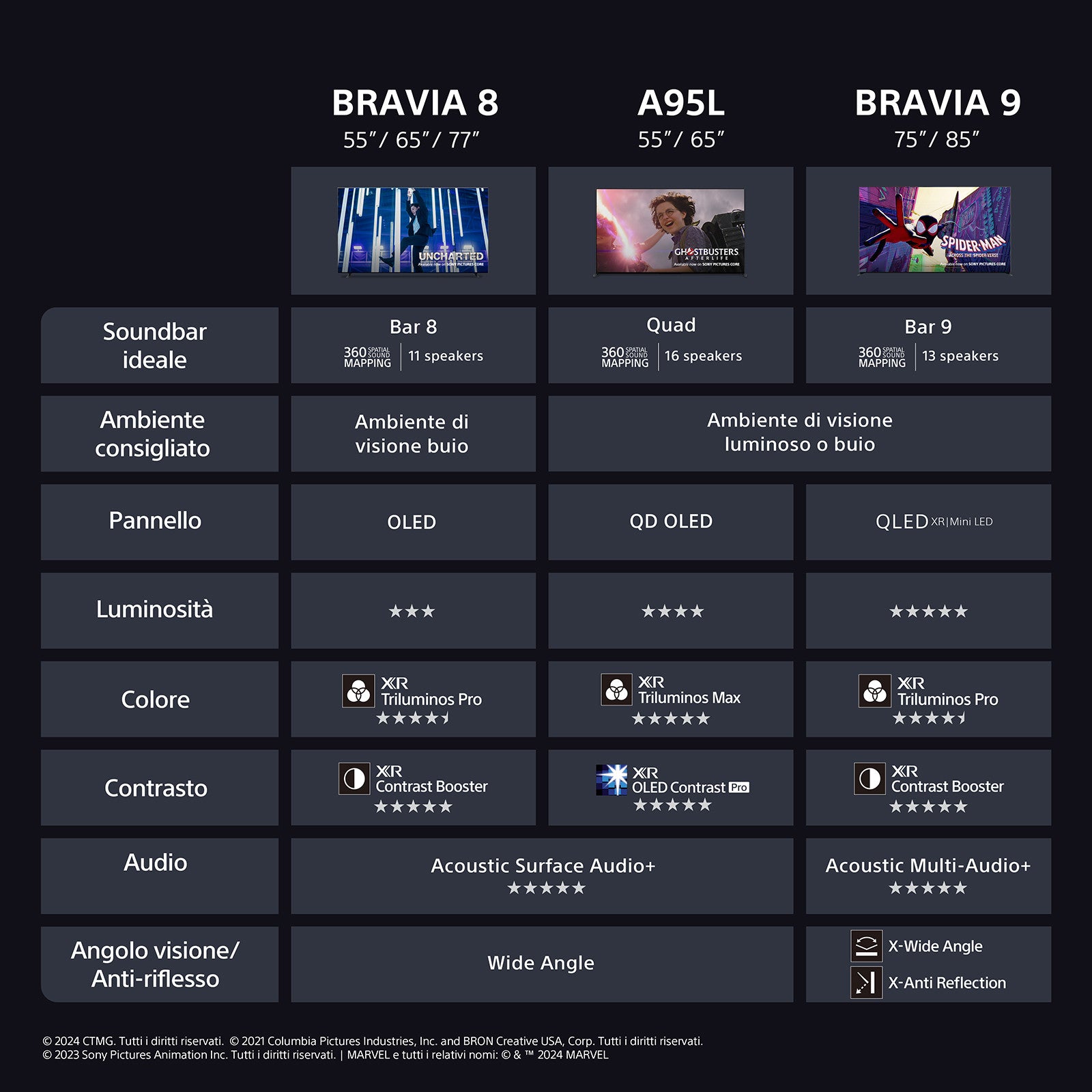 Il display OLED 4K da 55 pollici presenta oltre 8 milioni di pixel autoilluminanti, garantendo neri profondi e colori vividi per un'immagine straordinariamente realistica. La tecnologia XR Contrast Booster ottimizza il contrasto, offrendo dettagli nitidi sia nelle scene luminose che in quelle scure.
