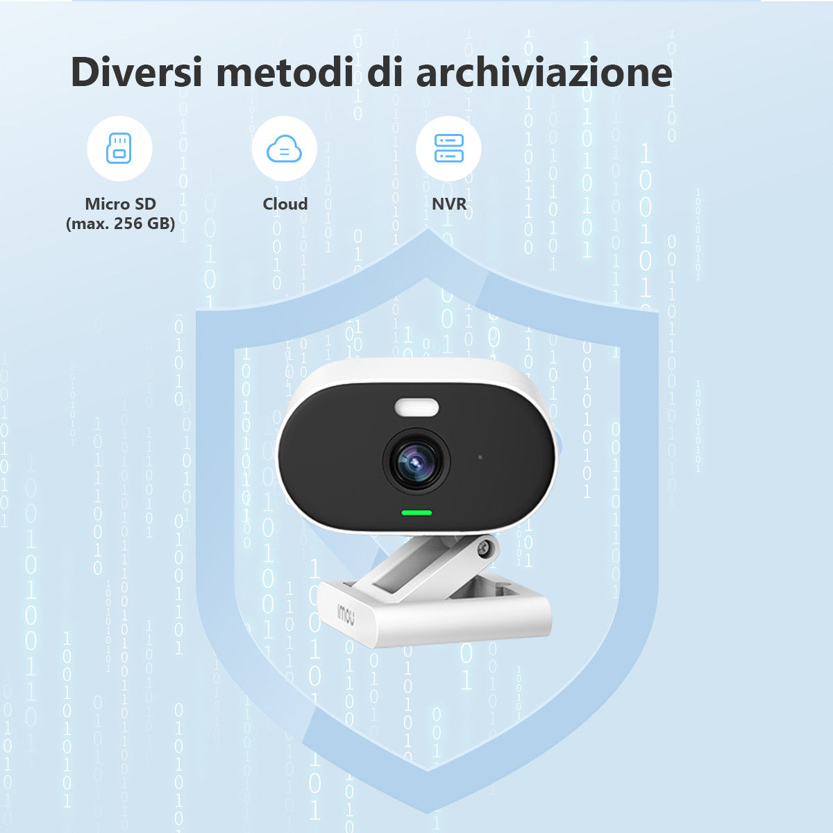 Per garantire la massima sicurezza, la Imou Versa è dotata di tecnologie avanzate come il rilevamento di suoni anomali e la compressione video H.265, che ottimizza lo spazio di archiviazione senza compromettere la qualità delle immagini. La telecamera di sorveglianza supporta l'archiviazione su cloud, scheda MicroSD fino a 256GB o NVR Imou, offrendo flessibilità nella gestione dei dati.