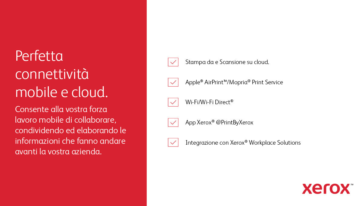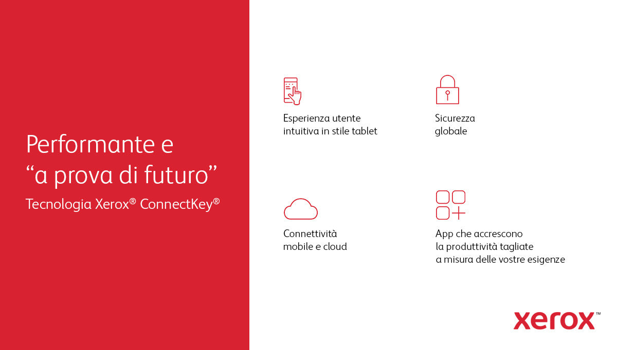 Con un ciclo di lavoro mensile fino a 150.000 pagine, la VersaLink C620 è costruita per resistere alle sfide di ambienti di stampa ad alto volume. La sua affidabilità è supportata dalla tecnologia Xerox ConnectKey®, che offre un'esperienza utente coerente e la possibilità di integrare app e soluzioni per ottimizzare i flussi di lavoro.