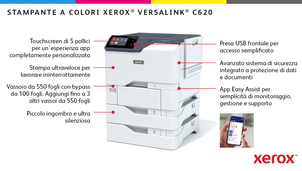 Scopri la potenza e l'efficienza della Xerox VersaLink C620, la stampante laser a colori progettata per soddisfare le esigenze di gruppi di lavoro dinamici e produttivi. Con una velocità di stampa impressionante di 52 pagine al minuto, questa stampante A4 è pronta a trasformare il vostro ufficio in un centro di produttività senza pari.