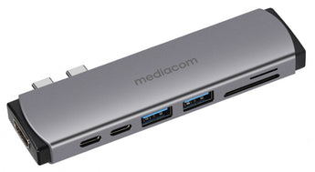 Scopri la potenza e la versatilità della docking station Mediacom MD-M201, l'accessorio indispensabile per il tuo MacBook Pro e altri dispositivi USB-C. Realizzata in elegante alluminio, questa docking station si integra perfettamente con il design del tuo laptop, offrendo una soluzione completa per espandere le tue connessioni.