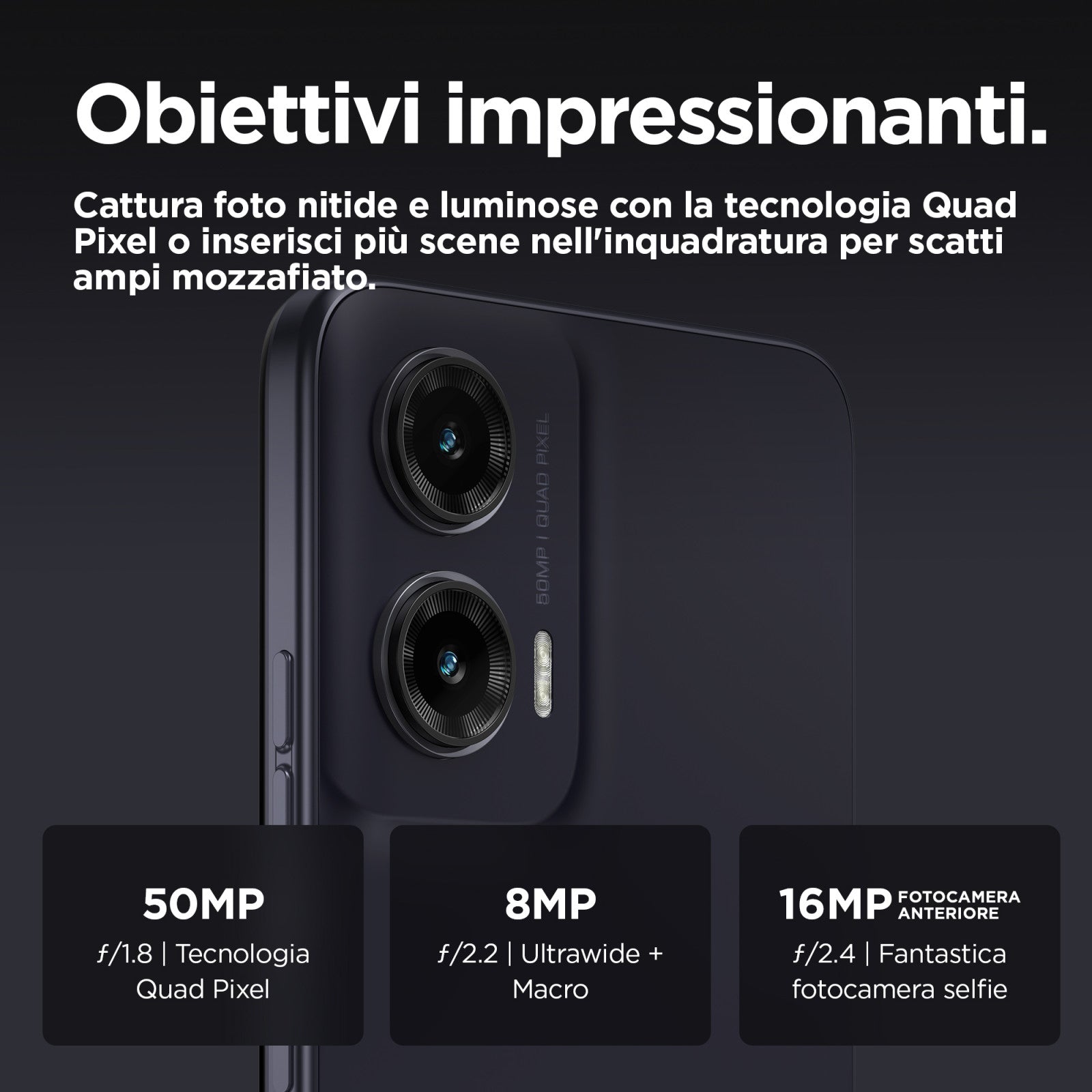 La fotocamera principale da 50 MP con tecnologia Quad Pixel cattura immagini nitide e luminose in qualsiasi condizione di luce. L'obiettivo ultragrandangolare ti permette di ampliare la prospettiva per scatti mozzafiato.