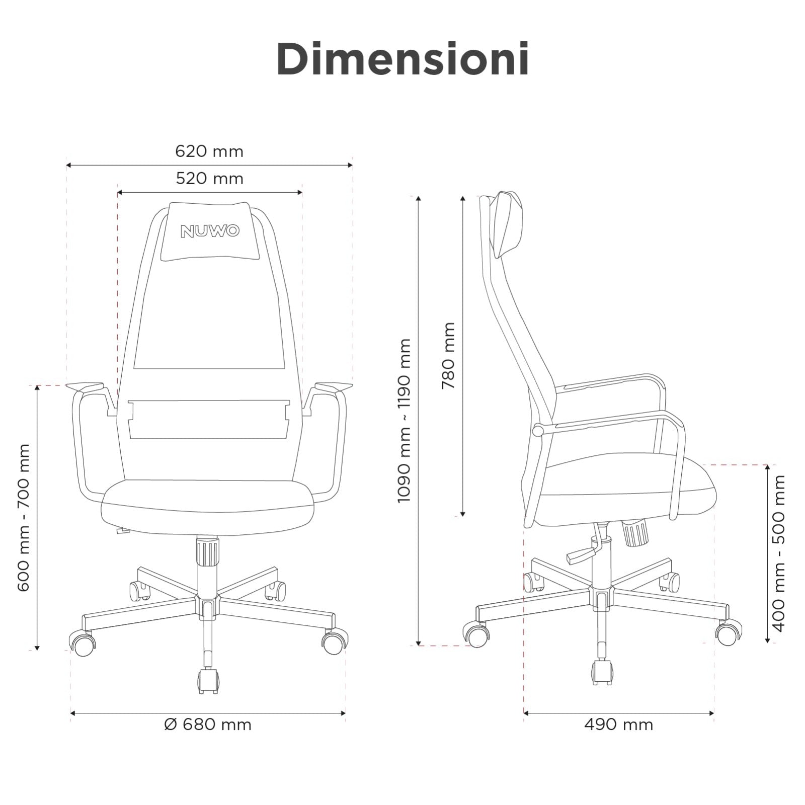 Con dimensioni generali di 620 mm x 600 mm x 1090~1190 mm, la NUWO Grid si adatta perfettamente a qualsiasi spazio, offrendo al contempo ampio spazio per muoversi comodamente. Il sedile misura 520 mm x 490 mm x 60 mm, fornendo una superficie ampia e confortevole per lunghe ore di utilizzo.