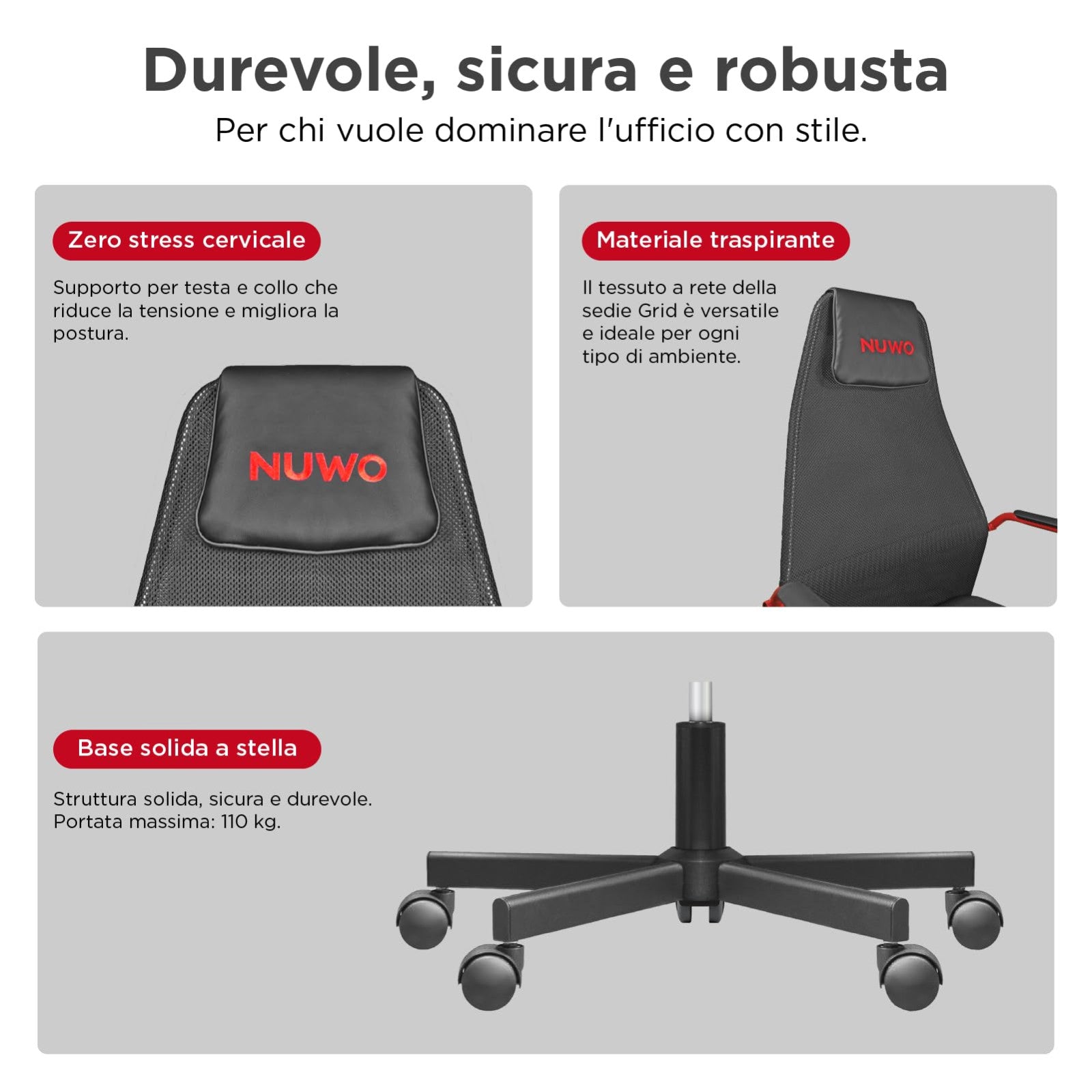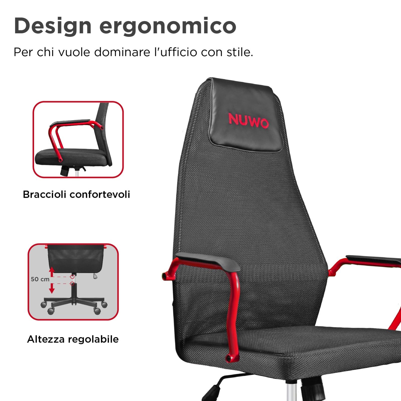 La NUWO Grid si distingue per il suo design rosso e nero accattivante, che si adatta perfettamente a qualsiasi setup gaming o ufficio moderno. La sua struttura ergonomica è stata studiata per offrire un supporto ottimale durante le lunghe sessioni di utilizzo, riducendo l'affaticamento e migliorando la postura.