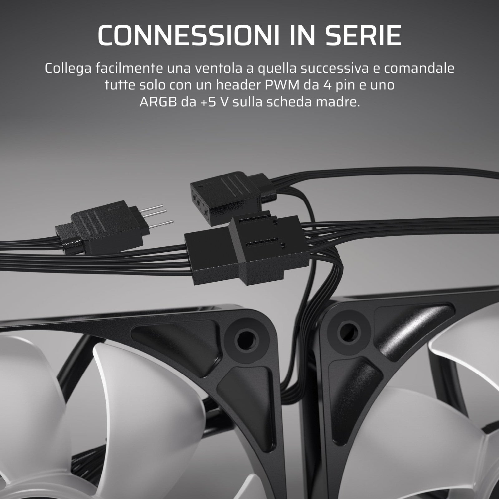 Le Corsair RS120 dispose d'un système de connexion en guirlande innovant, simplifiant l'installation et réduisant l'encombrement des câbles. L' en-tête PWM à 4 broches offre un contrôle précis de la vitesse, tandis que l'éclairage ARGB personnalisable vous permet de créer des effets d'éclairage à couper le souffle.