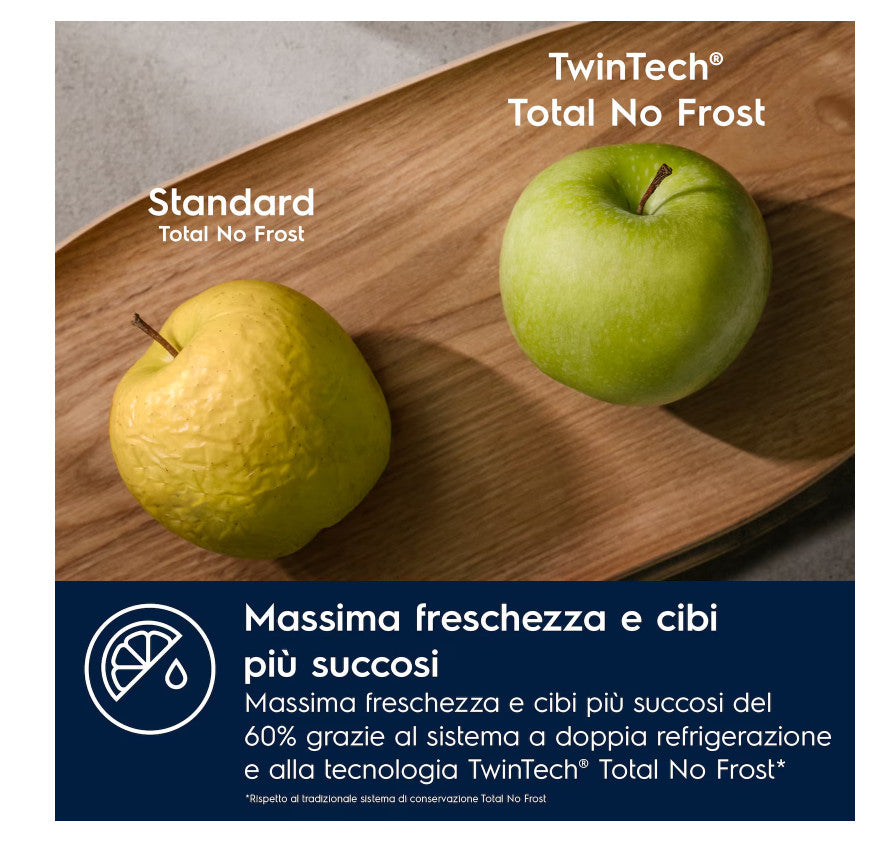 La tecnologia Total No Frost elimina la necessità di sbrinare il frigorifero, risparmiando tempo e fatica. Il sistema di raffreddamento doppio TwinTech preserva fino al 60% di idratazione in più rispetto ai frigoriferi con un solo evaporatore, mantenendo i tuoi cibi succosi e idratati.