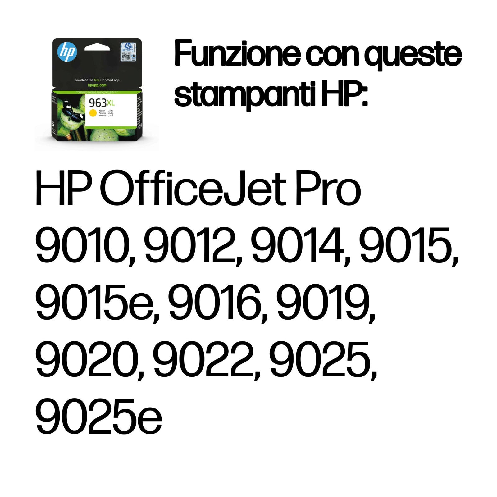 • Compatibilità: Le cartucce di inchiostro originali HP 963 funzionano con i seguenti dispositivi: HP OfficeJet Pro 9010, 9012, 9014, 9015, 9015e, 9016, 9019, 9020, 9022, 9025, 9025e