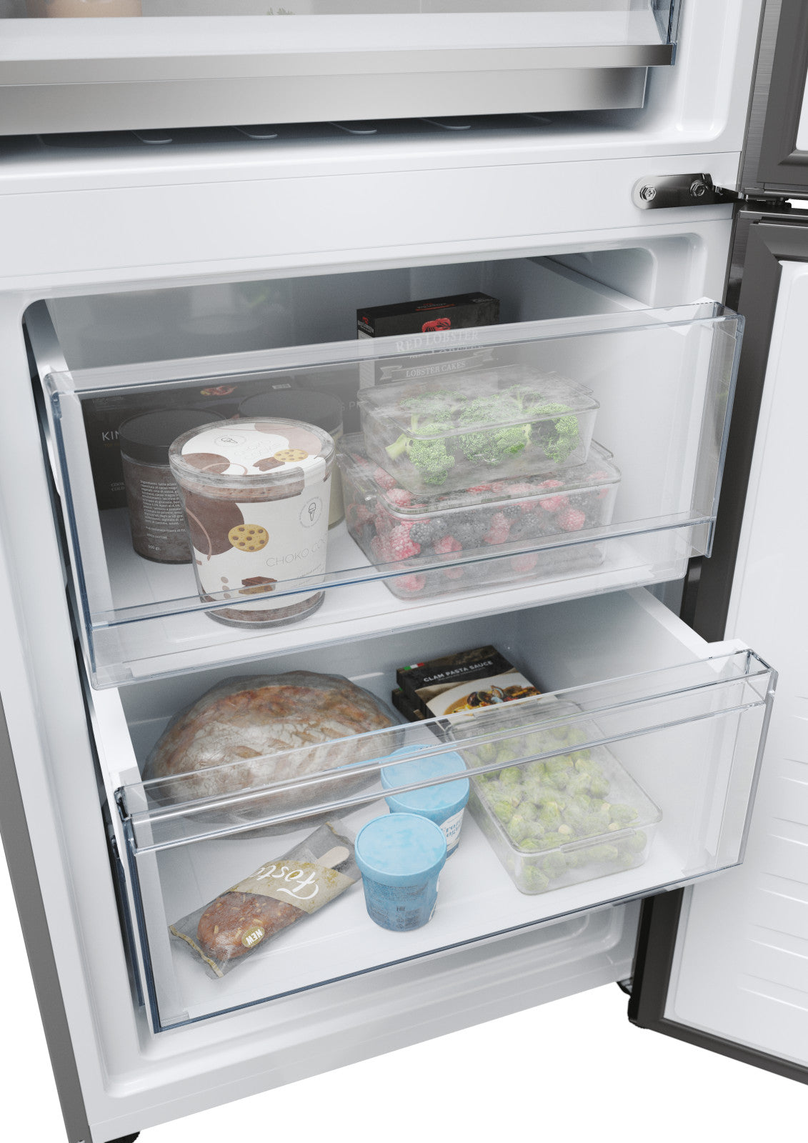 Il design antracite del Frigorifero Haier si adatta perfettamente a qualsiasi stile di cucina, aggiungendo un tocco di eleganza e modernità. Il display integrato sulla porta permette di visualizzare e regolare facilmente le impostazioni, mentre l'illuminazione interna a LED offre una visibilità ottimale degli alimenti.